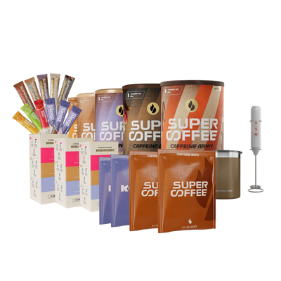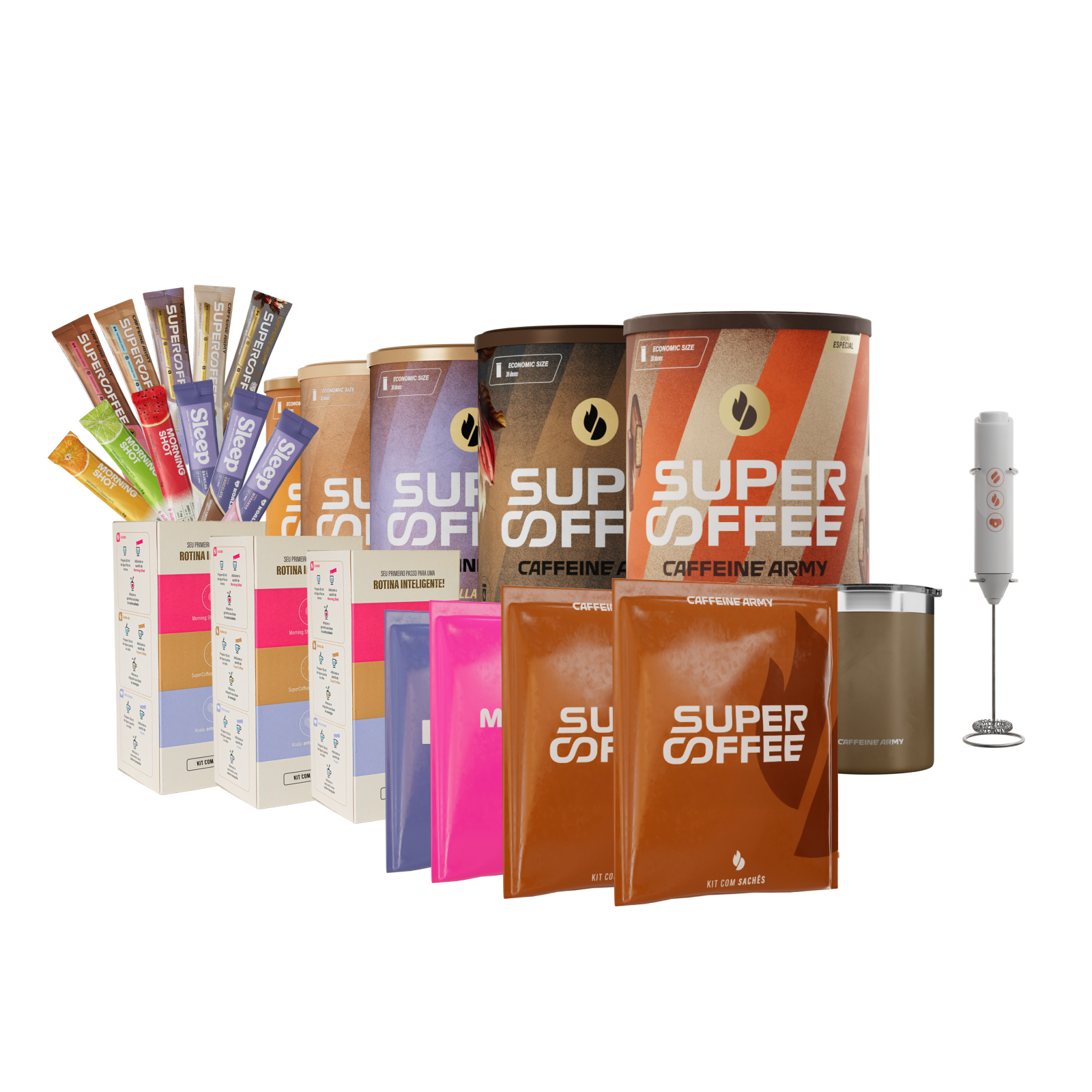 5 SuperCoffee 380g + 4 Kits de Sachês (5 unidades) + 3 Kits de Sachês (11 unidades - SuperCoffee, Morning Shot e Koala)